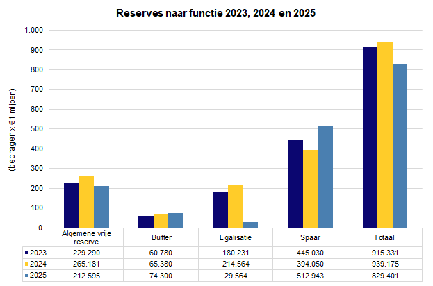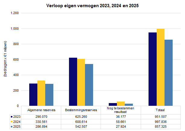 Het eigen vermogen bestaat uit de Algemene reserve, de bestemmingsreserves en het nog te bestemmen rekeningresultaat. Onderstaand overzicht laat het verloop zien van het eigen vermogen sinds 2023.